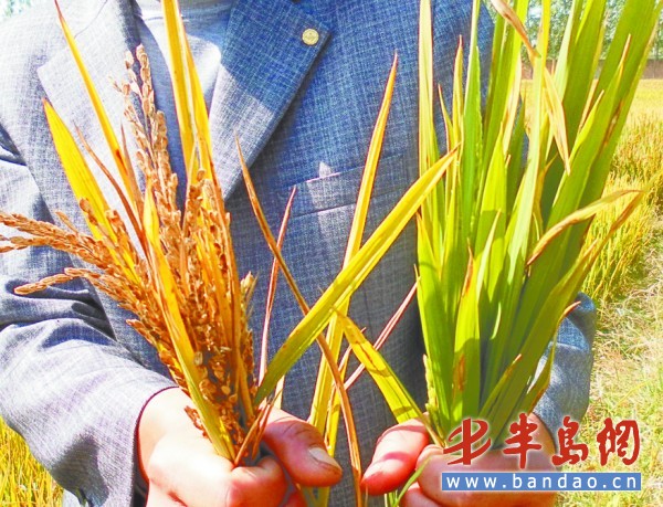 卞文国的水稻(右)还没抽穗,正常的水稻(左)颗粒饱满 。