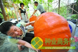 2010年9月2日,在江苏省泰州市海陵现代农业科技示范园区,新采摘的巨型南瓜吸引了游人。南瓜直径近1米,高0.6米,重180公斤,是通过航天育种培育成的新品种。