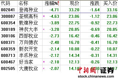 中新网11月29日电 因农业部曝光不合格种子企业名单中,上市种业公司五成上榜。种业股今日开盘后便遭重挫。盘初,神农大丰(300189,股吧)、敦煌种业(600354,股吧)、荃银高科(300087,股吧)、登海种业(002041,股吧)均进入两市跌幅前十,其中登海种业为两市最大跌幅股。