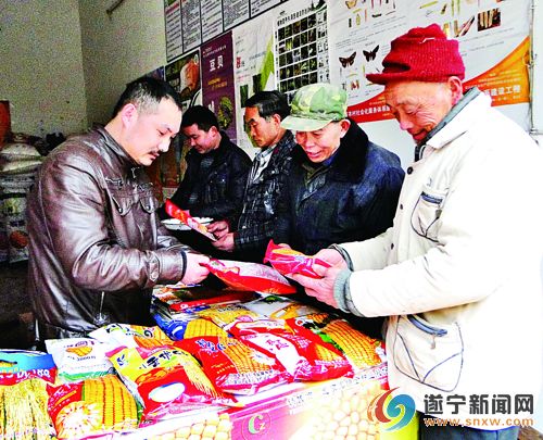 3月2日,在安居老城区交通街种子销售点,农民群众正在选购玉米种子,从2月下旬开始,该销售点每天出售水稻、玉米种子100公斤以上。开春以来,区农业局、供销、邮政等部门抓紧农资购销调配,加大农资保障力度,已储备“两杂”种子682吨、化肥1.6万吨、农膜85吨、农药72吨,为全区大春生产提供物资保障。