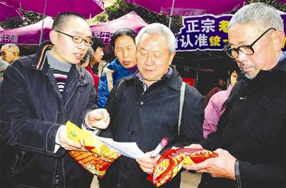 3月14日,内江市东兴区农业执法人员在高桥镇农贸市场开展消费维权知识宣传活动,向过往农民群众讲解真假种子的辨别方法。