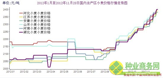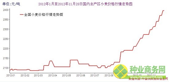 由上面的走势图可以看出,自9月份以来,全国小麦价格震荡上涨,11月之后增长之势更加迅猛。
