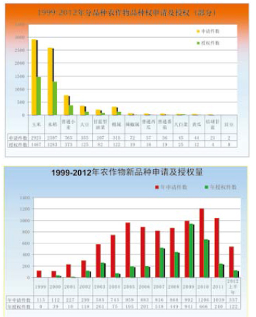 截止到2012年5月31日,我国已累计受理农作物新品种权申请量、授权量分别为9381件和3835件,授权件数占申请件数的45%左右。品种权年申请量在2005年以前一直保持30%左右的增长,之后处于徘徊,2010年申请规模超过1000件。林业植物品种权授权量较小,国家林业局植物新品种保护办公室网站显示,包括林木、观赏植物、果树在内十多年来共授权239件。