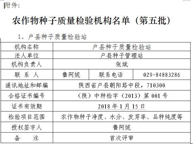 根据《中华人民共和国种子法》《农作物种子质量检验机构考核管理办法》等有关规定,经我厅考核,户县种子质量检验站等5个农作物种子质量检验机构具备对外开展农作物种子检验的基本条件和能力,批准为合格种子检验机构,颁发《中华人民共和国农作物种子质量检验机构合格证书》,准许在批准的种子检验项目范围内使用农作物种子质量检验机构合格标志。