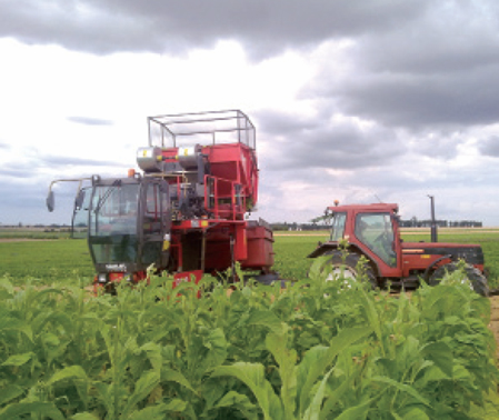 法国北部的Englbelmer,有一块七八公顷的烟草地。图为两个农民相互合作收烟叶过程:左边机器为已装满烟叶的烟草收割机,右边为拉着拖车的拖拉机;收割机将烟叶卸到拖车上后继续收割,拖拉机则将烟叶运往加工场所。一个来回约30分钟,能处理约7立方米烟叶。