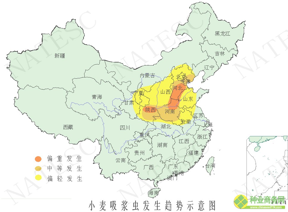 蚜虫、吸浆虫、一代粘虫和麦蜘蛛是小麦主产区中后期最严重的虫害,地下害虫、灰飞虱、麦叶蜂和麦茎蜂等在局部地区会造成一定危害。