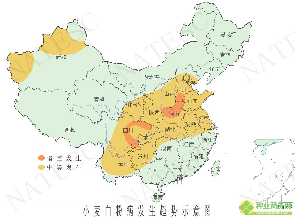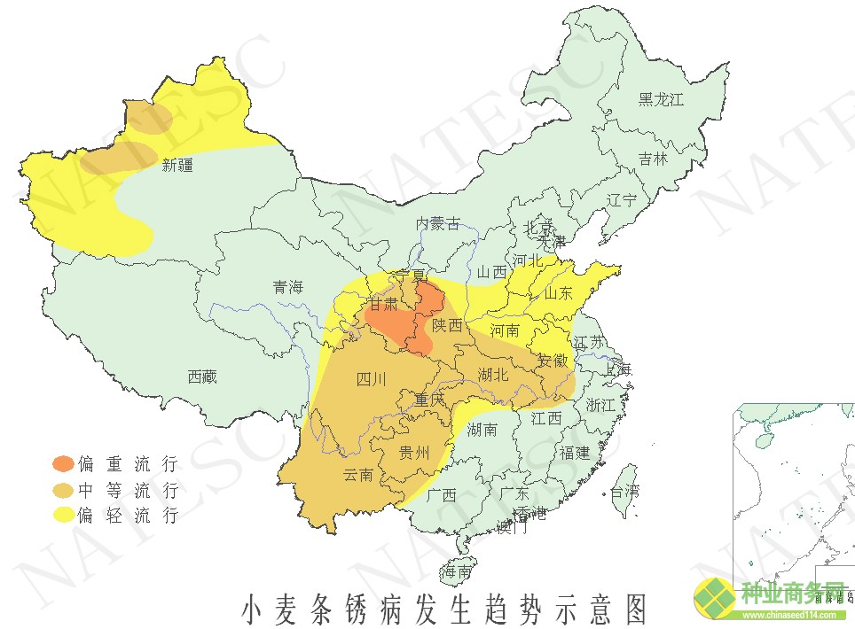 2、条锈病。全国发生面积约3000万亩,接近上年。甘肃中部晚熟麦区、天水渭河以南和陇东川水地、陕西汉中西部呈偏重流行态势,甘肃其他地区、陕西南部和关中西部、湖北、河南南部、安徽中南部、宁夏南部、新疆伊犁河谷和南疆西北部及西南大部中等程度流行,山西南部、山东西南部和胶东半岛、河北南部、青海东部有偏轻流行可能。流行盛期,西南东部、陕西南部、湖北为4月中、下旬,甘肃南部、陕西关中、河南为4月下旬至5月上旬,山东、山西、河北为5月上、中旬,甘肃陇东、宁夏、新疆为5月中旬至6月中旬,甘肃陇中、青海(春麦区)为6月下旬至7月中旬。