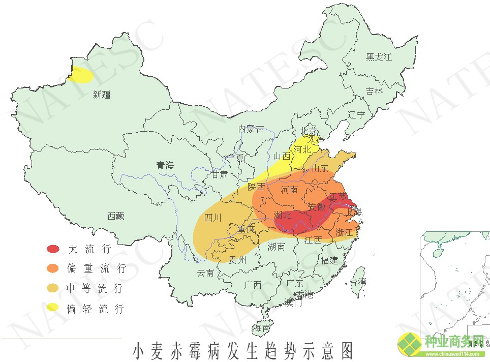 1、赤霉病。全国流行面积达1亿亩以上,流行程度明显重于常年。湖北江汉平原、安徽和江苏沿淮及以南麦区大流行,以上3个省其他地区、浙江北部、上海沿江沿海、河南南部及北部灌区、山东西南部、陕西关中东部偏重流行,西南地区东部、黄淮的其他麦区中等流行,河北中南部、山西南部、新疆伊犁河谷偏轻流行。病害预防适期,长江流域为4月中、下旬,黄淮和华北麦区为4月下旬至5月上旬。