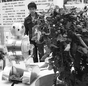 番茄采摘机器人(左)从判断番茄成熟程度到完成采摘、放置等一系列动作,用时不到一分钟。