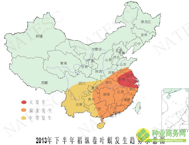 (三)气候条件对病虫发生较为有利。近期,江南、长江流域、西南等大部地区出现过程性降雨天气,雨日、雨量较常年明显偏多,不仅加剧了纹枯病、稻瘟病等扩展流行,也有利于“两迁”害虫由华南、江南早稻区向中晚稻区迁飞扩散危害。据国家气候中心预测,汛期我国旱涝并重,降水呈显著的阶段性特征雨带,其中东北地区、江淮东部、西南大部、华南南部降水偏多,有利于水稻稻瘟病、纹枯病的扩散蔓延和“两迁”害虫的发生繁殖;另外,夏季将有4-5个台风在东南沿海登陆或影响我国,对水稻病虫尤其是“两迁”害虫迁移危害十分有利。