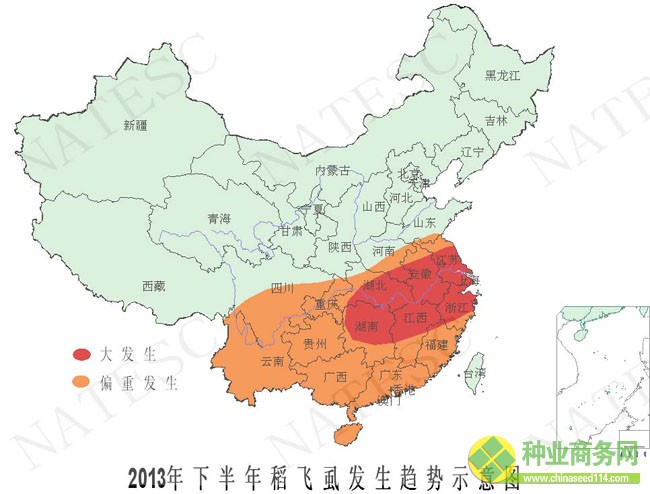 (一)水稻虫害。以迁飞性、钻蛀性害虫为主,预计发生面积7.3亿亩次。其中,稻飞虱在江淮、长江中下游、江南单季稻区大发生,华南、江南双季晚稻和西南单季稻区偏重发生,发生面积近3.0亿亩次。稻纵卷叶螟在长江中下游局部稻区大发生,华南、江南、西南东部稻区偏重发生,发生面积2.1亿亩次。二化螟在长江中游、西南中北部稻区偏重发生,发生面积1.4亿亩次;三化螟在华南东南部、西南大部稻区中等发生,发生面积1800万亩次;大螟在江淮稻区呈发生面积扩大、程度加重态势;灰飞虱、稻苞虫等其他虫害在部分稻区有一定程度发生,发生面积6500万亩次。