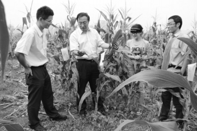 图为北京德农种业有限公司总经理吕楠博士(左二)与公司科研人员在品种定位试验田察看玉米新品种。