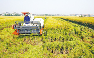 前天一大早,鄞州洞桥种粮大户许跃进开着“久保田”收割机,在百亩金黄色的超级杂交水稻稻田内试收割。