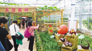昨日,现代农业展示馆内,各色各样的果蔬产品令人眼花缭乱,不少前来游览的游客不约而同地围到太空育种展位,与展示的“奇蔬异果”合影,不少人还现场买起了种子。
