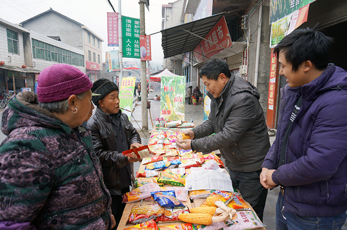 近年来,永顺县集中力量加强种子市场监管力度,严把春播种子市场准入关,规范种子经营行为,确保粮食安全工作措施到位。新春伊始,该县农民抓住当前雪后融水墒情好的有利时机,积极购备良种和农资,为春耕生产做准备。图为2月17日,该县吊井乡农资摊点前,农枝员向先金正在向选购农资的农民介绍和推荐玉米良种。