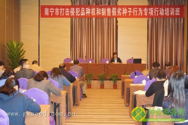 南宁市农业局韦新培副局长在开班仪式上布置了我市打击侵犯品种权和制售假劣种子行为专项行动的主要措施。自治区种子管理局市场管理科罗陈鹰科长分析了种子市场监管、品种套牌侵权、制售假劣种子等情况和开展打击专项行动的必要性。自治区农作物种子质量监督检验站黄祖纹科长带领大家学习了农作物种子质量监督抽查管理办法及工作要求等相关知识。自治区种子管理局唐忠平副局长对此次专项行动的企业监督检查、市场整顿、品种清退、制种基地整治、大案要案的查处提出了具体要求。培训班的召开,对我市种子市场秩序根本性好转起到积极的作用。