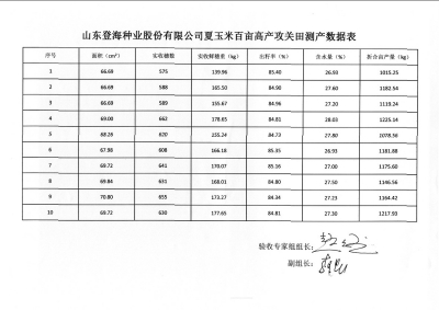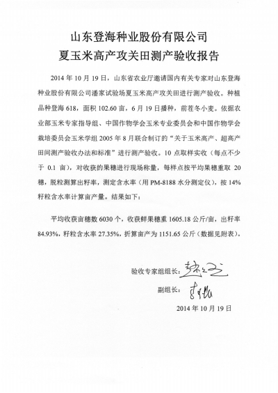 依据农业部玉米专家指导组、中国作物学会玉米专业委员会、中国作物学会栽培委员会玉米学组2005年8月联合制订的“关于玉米高产、超高产田间测产验收办法和标准”,10月18日至19日,全国玉米栽培学组有关专家在莱州市对山东登海种业股份有限公司紧凑型夏玉米高产攻关田进行了实地测产验收。最终验收结果表明,李登海选育的紧凑型高产早熟杂交玉米新品种“登海618”,面积102.60亩,亩产为1151.65公斤,创造了全国百亩方夏玉米高产新纪录;中矮秆大穗型玉米品种“登海661”,面积10亩,亩产1335.81公斤,刷新了全国十亩方夏玉米高产新纪录。