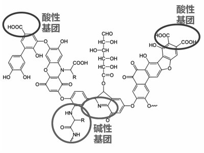 右图显示腐植酸分子结构图,分子中同时包含了碱性基团和酸性基团。