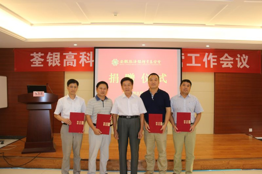 8月19日下午,张海银种业基金会“促进种业发展,助力学子圆梦”捐赠仪式在“荃银高科2015—2016年度经营工作总结暨下年度经营计划分析会”上举行。荃银高科子公司华安种业、湖北荃银种业、荃银高科高层管理人员刘义锐、郑满生共计向基金会捐赠人民币34.7万元,张海银理事长代表基金会接受捐赠,并向捐赠者颁发捐赠荣誉证书。
