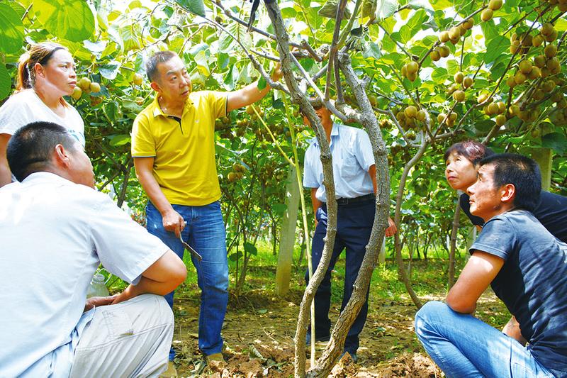 技术团队经过一个多月深入走访周至县多个猕猴桃黄化病、根腐病、褐斑病的果园,成功将周至县多个猕猴桃园的黄化病进行有效控制。图为,陕西省果业协会葡萄分会副会长、陕西今日生物化工科技发展有限责任公司总经理丁西平现场为果农分析挂果期猕猴桃树势弱、叶片早衰的原因。