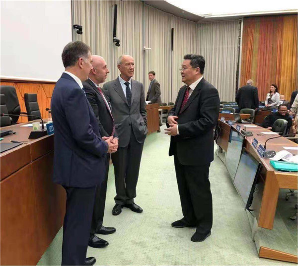 崔野韩博士(右一)与世界知识产权组织(WIPO)总干事、UPOV秘书长Francis Gurry先生(右二),UPOV副秘书长Peter Button先生(左一),UPOV行政管理和法律委员会主席Anthony Parker先生(左二)交谈