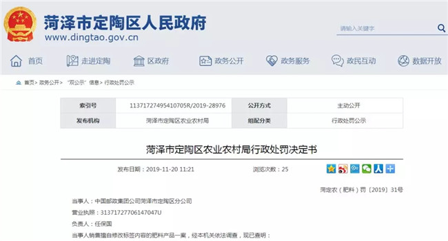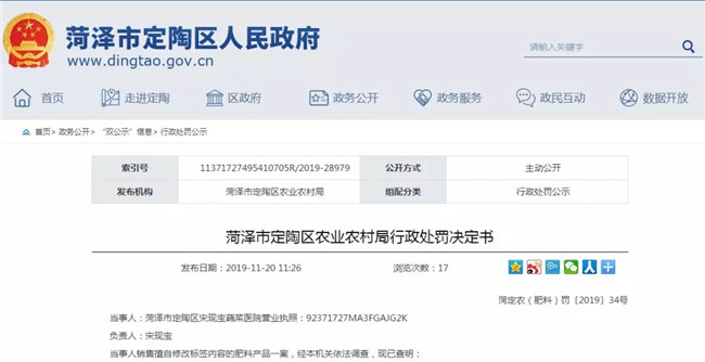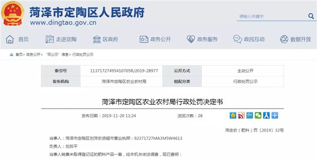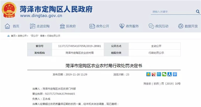 近日,山东省菏泽市定陶区人民政府连续发布8则行政处罚决定书。9-10月期间,菏泽市定陶区农业农村局(以下简称“定陶农业农村局”)对定陶区农资店例行检查,发现农资市场存在销售过期农药、未取得农药经营许可经营农药、销售擅自修改标签内容的肥料、种子标签内容不符合《种子法》规定等不合法现象。根据相关法律规定,定陶农业农村局没收不合格农资,并对涉事农资店作出2000-5000元不等的罚款。
