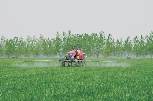 在安徽省宿州市埇桥区顺河乡万桥村,农户用自走式植保机给小麦喷洒农药,防控赤霉病。 祝家刚 张大伟 摄