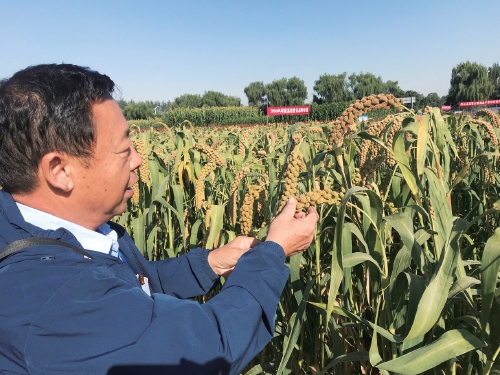 山西农业大学谷子育种专家郭二虎在展示基地察看品种的田间表现。