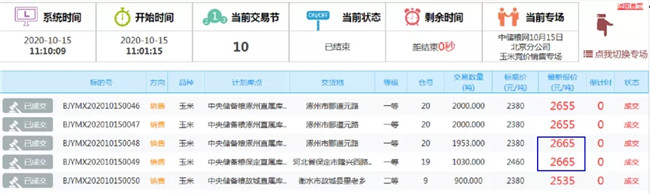 中储粮网10月15日北京分公司玉米竞价销售计划投放71513吨,全部成交,最高价格2665元/吨。