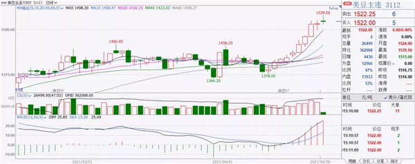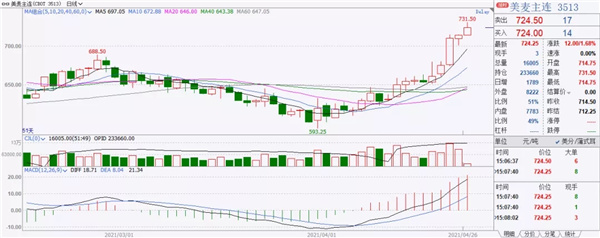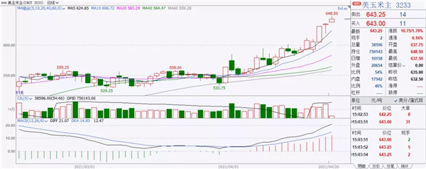 4月26日,CBOT玉米期货基于上周的猛烈涨势,进一步突破8年高位。由于全球供应担忧和强劲需求,玉米占据主导地位,推高小麦涨至七年高位和大豆触及八年高位。
