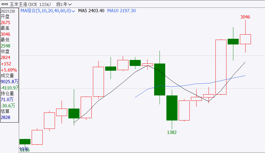 2022年,国内物流不畅、国际农产品价格波动等因素造成国内玉米市场震荡。截至12月30日,玉米主力合约全年整体涨幅近6%;其中合约价格最高达3046元/吨,最低2548元/吨,振幅达18.64%。
