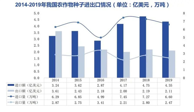 (4)种质资源依赖进口。我国种业大而不强,是种子的净进口国,2018年贸易逆差达2.24亿美元。我国主要的进口种子类别为草种和蔬菜种子,除了玉米种子小比重依赖进口,其余主粮种子基本实现完全自主,自主选育品种面积占比超95%。我国种业派生品种占比较高,而原始创新品种不够。