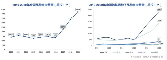 近年来,我国种业自主创新能力限制提升,2017年开始,品种审定数量开始快速激增。2019年全国国审和省审品种审定数量4219个,同比增加26.5%。此外,玉米和水稻转基因种子的审定数量上升幅度大。截至2020年,玉米的审定数量达到2817个,水稻的审定数量为1913个。