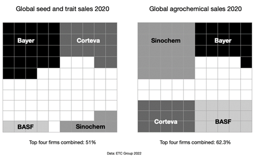 2018 年至 2022 年,农化和种业公司内部的全球集中和整合趋势继续不受阻碍。拜耳、巴斯夫、科蒂瓦和中化这 "四大 "农化公司都通过战术性收购和兼并来增强实力。2021年,中化集团和中国化工集团的巨额合并标志着农业食品体系的明显变化--中国政府拥有的两家巨头公司的结合导致了世界上最大的化工集团和第三大种子公司的形成,并以先前收购的瑞士巨头先正达公司的名义运作(ETC 2022)。