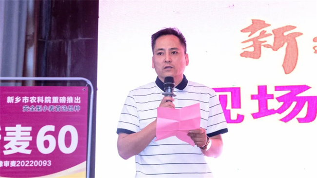 河南农业大学郭天财教授、新乡市农科院书记、院长杨海峰,焦作市种子站焦竹青站长分别致辞。郭天财教授在致辞中说道:“当前黄淮主产区小麦已全面进入扬花和灌浆期,也是小麦产量形成的重要时期,同时也是各个品种性状优劣的展现期。新麦60这个品种,通过前期的关注和今天的观摩,作为一名栽培科技工作者,综合表现优秀,对其市场前景值得期待,希望晨旭种业加大宣传力度,做好高产示范和种植售后服务,使新麦60在生产上发挥更大作用,为保障国家粮食安全做出应有贡献!”;杨海峰书记详细介绍新乡市农科院有关科研进展和科技成果,对晨旭种业先进经营理念和健全的营销网络表示高度认可,并表示,新乡市农科院将全力支持晨旭种业新麦60的示范推广工作;焦作市种子站焦竹青站长详细介绍了焦作市种业发展情况和品种应用情况,希望晨旭种业不忘初心,继续做好新麦60推广应用工作,为焦作种业高质量发展做出积极贡献!