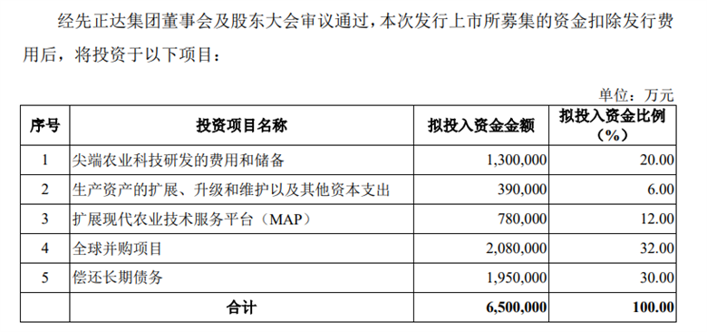 此次上市所募集资金,先正达集团将用于五个方面。其中人民币208亿元将用于实施全球并购项目,195亿元用于偿还长期债务,130亿元用于农业科技研发和储备,78亿元用于拓展现代农业技术服务平台(MAP),39亿元用于生产资产的扩展、升级和维护以及其他资本支出。