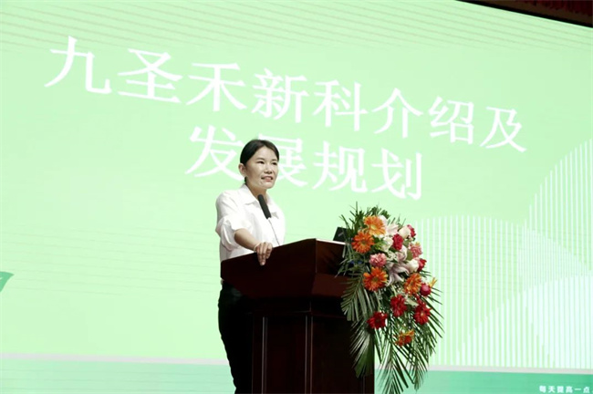 九圣禾新科种业总经理骆芳女士就公司基本情况和未来发展规划做精彩分享。据介绍,九圣禾新科种业是国家高新技术企业、河南省专精特新中小企业、农业产业化省重点龙头企业,公司自主审定农作物品种33个,在建育种中心试验站12个,并与中国农科院等8家科研院所建立紧密合作关系,后备优势品种资源丰富,将会为农民增收、农业增效,保障国家粮食安全提供有力的科技支撑。并发布公司小麦新品种明日之星:优质强筋高产—新麦58,穗子大,抗性强,品相好;产量高—新麦9369,抗倒春寒,耐高温;真高产—商麦178,抗倒伏,抗病性强,落黄好;高产稳产—新科麦170。谈到新科种业发展规划,她表示,未来三年,新科种业力争小麦销售业务达到全国前三,销售量达到6万吨,销售额超3个亿。并表示,九圣禾新科种业愿携手更多合作伙伴筑梦前行,蓄势共赢,迈向新未来!