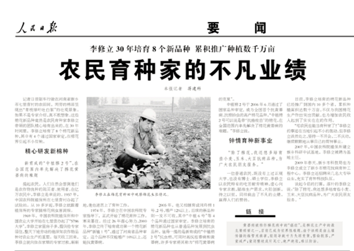 历经多年的努力,李修立选育的“视察”系列棉花品种从1992年起陆续获得市场认可,系列中的7个品种以每年至少60万斤销量进行推广。2000年新《种子法》实施后,李修立在中国农科院专家的指导下参与系列棉花品种的审定。2004年,李修立培育的“新植1号”通过河南省品种审定,这个品种不仅能增产10%以上,还能抗黄萎病。