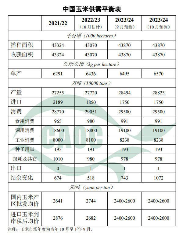 全国大部分主产区天气好于常年,东北地区初霜偏晚,热量条件较好,有利于玉米成熟、收获,2023/24年度平均玉米单产超出此前预期,本月将单产预测值上调至6570公斤/公顷,预计总产28823万吨,较上年度增1103万吨。本月其它数据不调整。