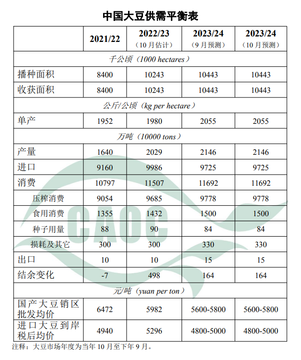 2022/23年度,中国国产大豆销区批发均价每吨5982元,较上年下跌7.6%,处于预测区间。本月对2023/24年度市场供需数据不做调整。国内主产区大豆即将进入集中收获和上市高峰期。