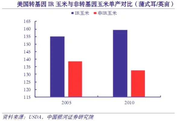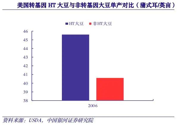 以美国为例,根据USDA数据,2006年美国转基因HT耐除草剂大豆相比非转基因大豆单产高出12.32%;2010年美国转基因IR抗虫玉米相比2010 年同期美国非转基因玉米单产高出19.97%。