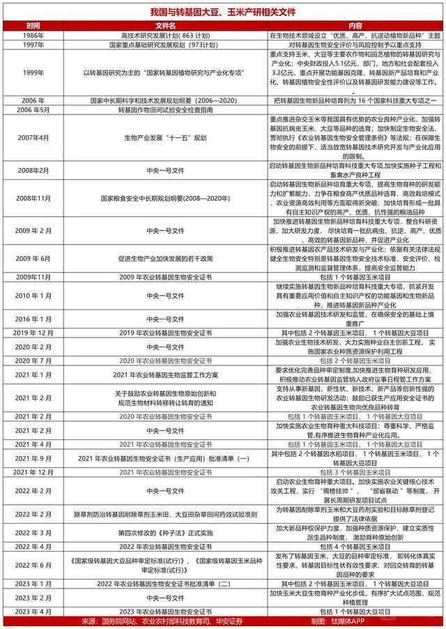 1986年3月开始实施的“高技术研究发展计划”,即“863”计划为我国转基因大业拉开了序幕。玉米、大豆作为饲料作物、油料作物,对养殖、食品行业影响重大,因此备受重视。据不完全统计,在过去三十多年中,政府推出的大豆、玉米相关的转基因文件超过30份。