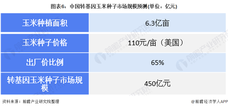 我国转基因技术应用的作物较少,若应用至玉米,中国种业的市场空间将得到大幅的提升。2019年我国玉米的种植面积为6.3亿亩,杂交玉米种子价格较低,约为56元/亩,若以美国一亩地玉米种子价格110元测算,我国转基因玉米的终端市场收入空间达693亿元,若出厂价按照65%的终端价,市场空间为450亿元。