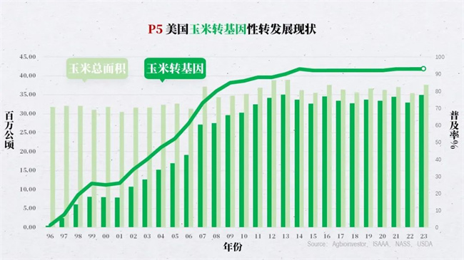 P5 是 1996-2023 年美国玉米和转基因玉米的种植面积及转基因玉米的普及率,2023年玉米面积有不少的增加,2023 年转基因比例与上年持平,为 93%。