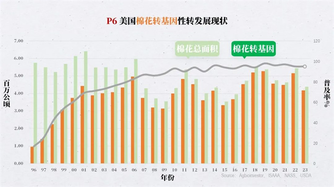 P6 是 1996-2023 年美国棉花和转基因棉花的种植面积及转基因棉花的普及率,2023年棉花面积大幅下跌,甚至跌破 2021 年的面积,2023 年转基因比例比上年增加 2 个百分点,为 97%。