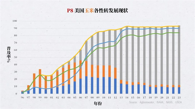 P8 是 1996-2023 年美国转基因玉米各种性状的普及率,单抗不断降低,双抗不断增多,2023 年达 82%。