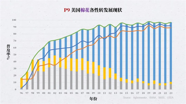 P9 是 1996-2023 年美国转基因棉花各种性状的普及率,单抗不断降低,双抗不断增多,2023 年达 86%。