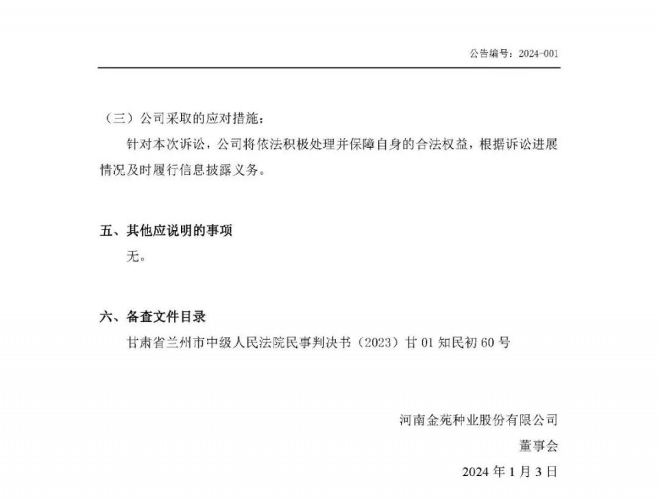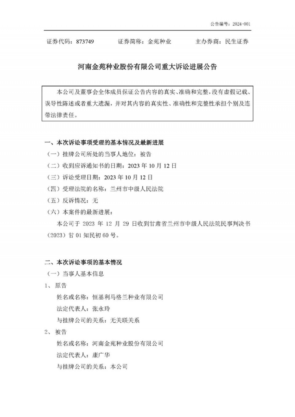 1月3日,河南金苑种业股份有限公司(以下简称金苑种业)发布重大诉讼进展公告。