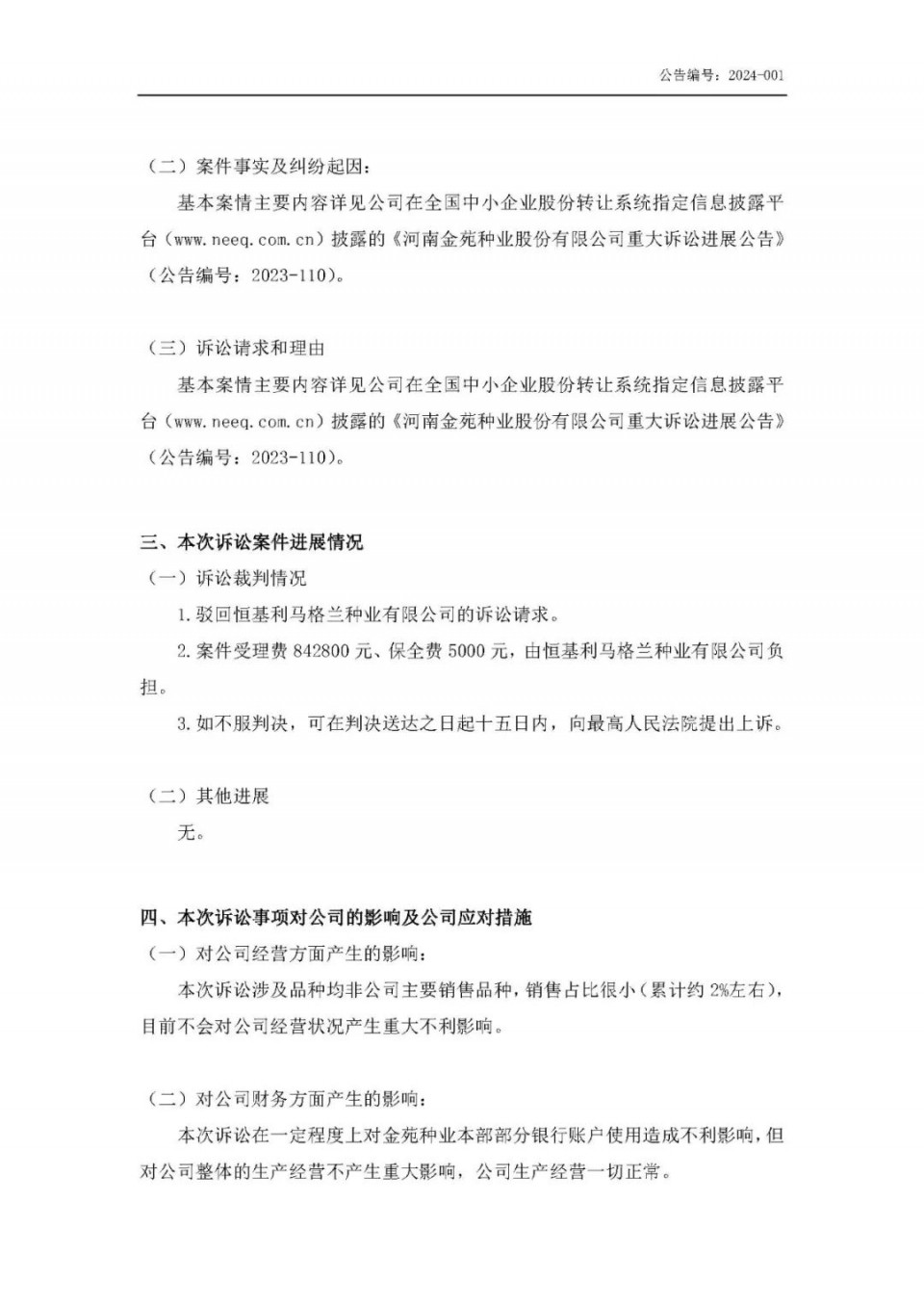 根据公告,金苑种业于2023 年12月29日收到甘肃省兰州市中级人民法院民事判决书 (2023)甘01 知民初60号。恒基利马格兰起诉金苑种业一案,进展情况如何?