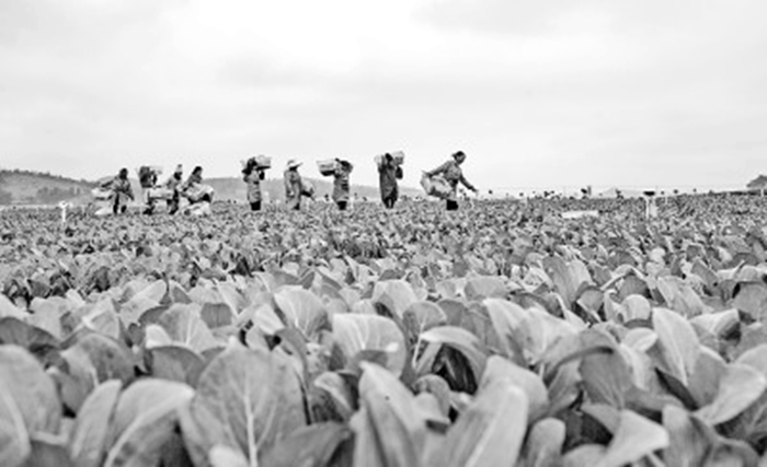 在云南省文山壮族苗族自治州砚山县,农民在一家蔬菜基地收获蔬菜。